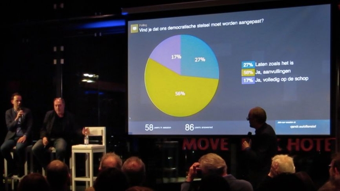 In the second part of the evening Niesco used a QANDR poll to find out from the audience whether they believe the current political model should be adjusted with extra democratic tools like the referendum or a directly elected mayor. It was interesting to see how audience opinions influenced the discussion on stage and how some people raised their voice when they felt the visualisation of alternative models (again a pointer) did not contain all the options they wanted.