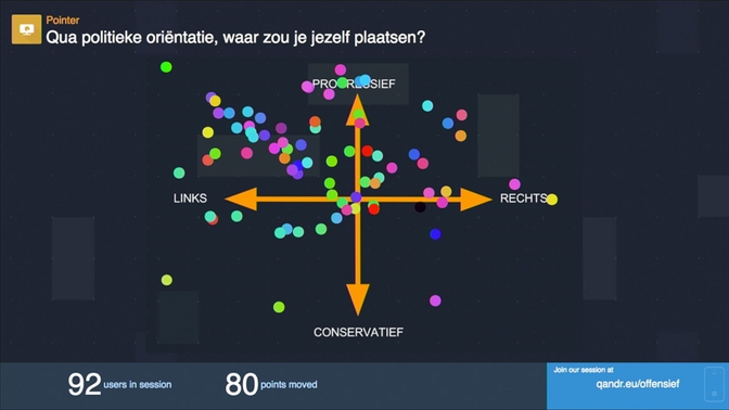 Discussion leader Niesco Dubbelboer used QANDR in several ways to create interaction with the audience of ninety. At the start of the debate the pointer was used to visualise the places of residence of the people in the audience on a map of the Netherlands. Niesco then used the same method to ask the audience to indicate their political orientation inside a quadrant with left-right and progressive-conservative dimensions.