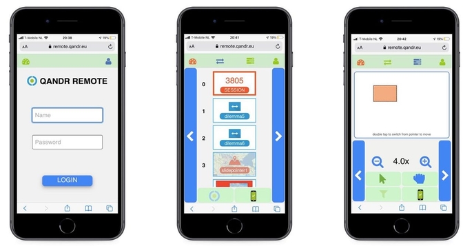 The QANDR Remote Control is especially developed for the facilitators of a session, to use their own smartphone to control the session, so they can easily move around in the room.