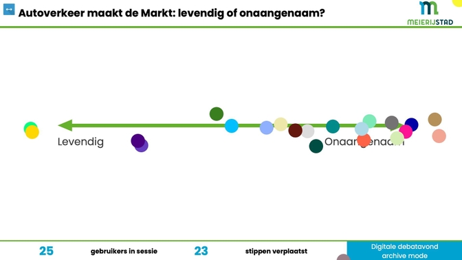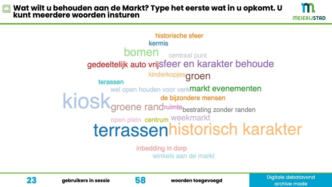 In the course of the evening several different QANDR modules were used, such as the poll to obtain a global profile of participants, de pointer to indicate residents’ dreams, the wordcloud to determine what in the market square needs to be preserved and the dilemma to gauge opinions on car traffic and type of street paving. Check all visuals of the debate night, directly generated from Meijerijstad’s QANDR archive.